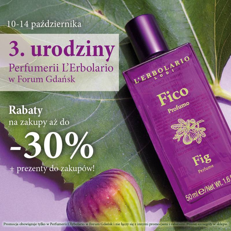 W dniach 10-14 października Perfumeria L’Erbolario w Forum Gdańsk zaprasza do wspólnego świętowania jej 3. urodzin. Czekają rabaty na całe zakupy aż do -30%, prezenty do zakupów oraz słodki poczęstunek.
