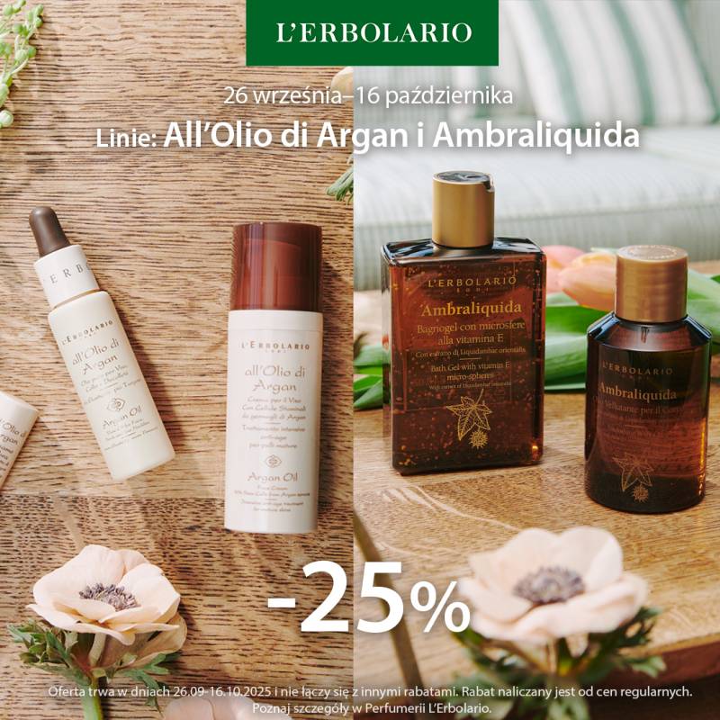 Kolekcje All’Olio di Argan i Ambraliquida kupisz teraz z rabatem 25% w Perfumerii L’Erbolario.